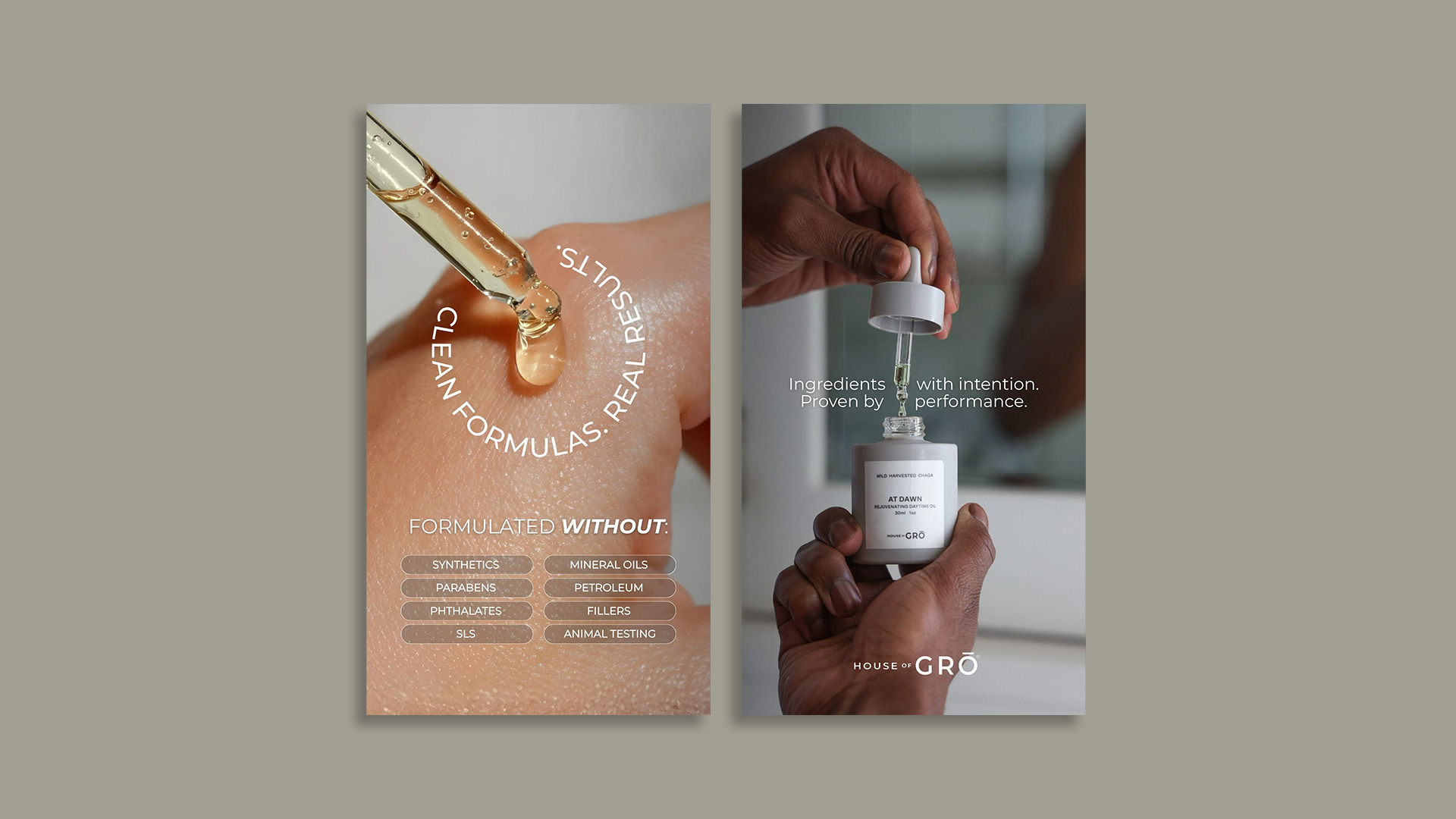 This client is House of GRO, which is a "Antioxidant-Rich Mushroom Skincare" brand that offers 5 different skincare products to customers, all made using chaga mushrooms and other natural ingredients. Their Instagram is @houseofgro.