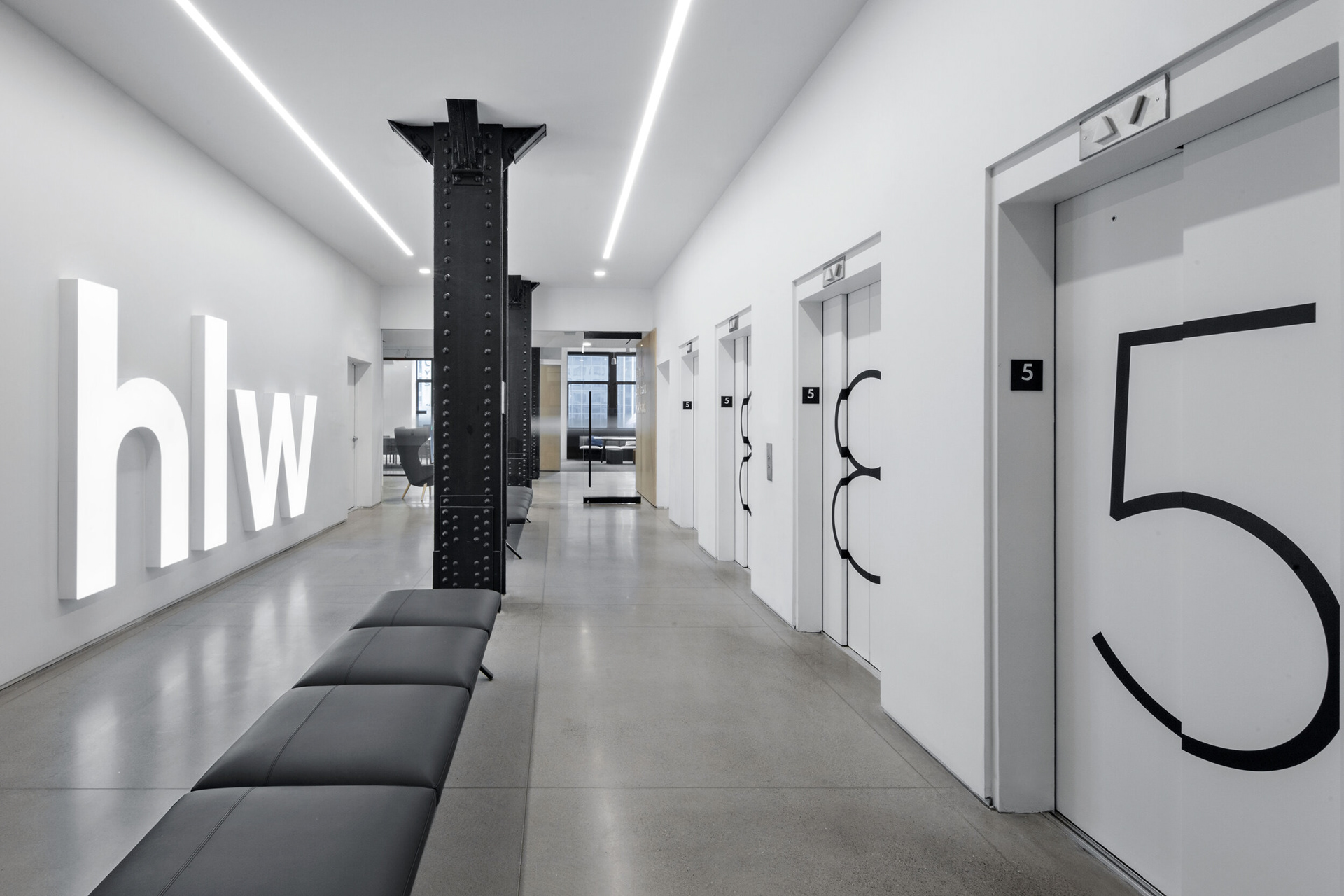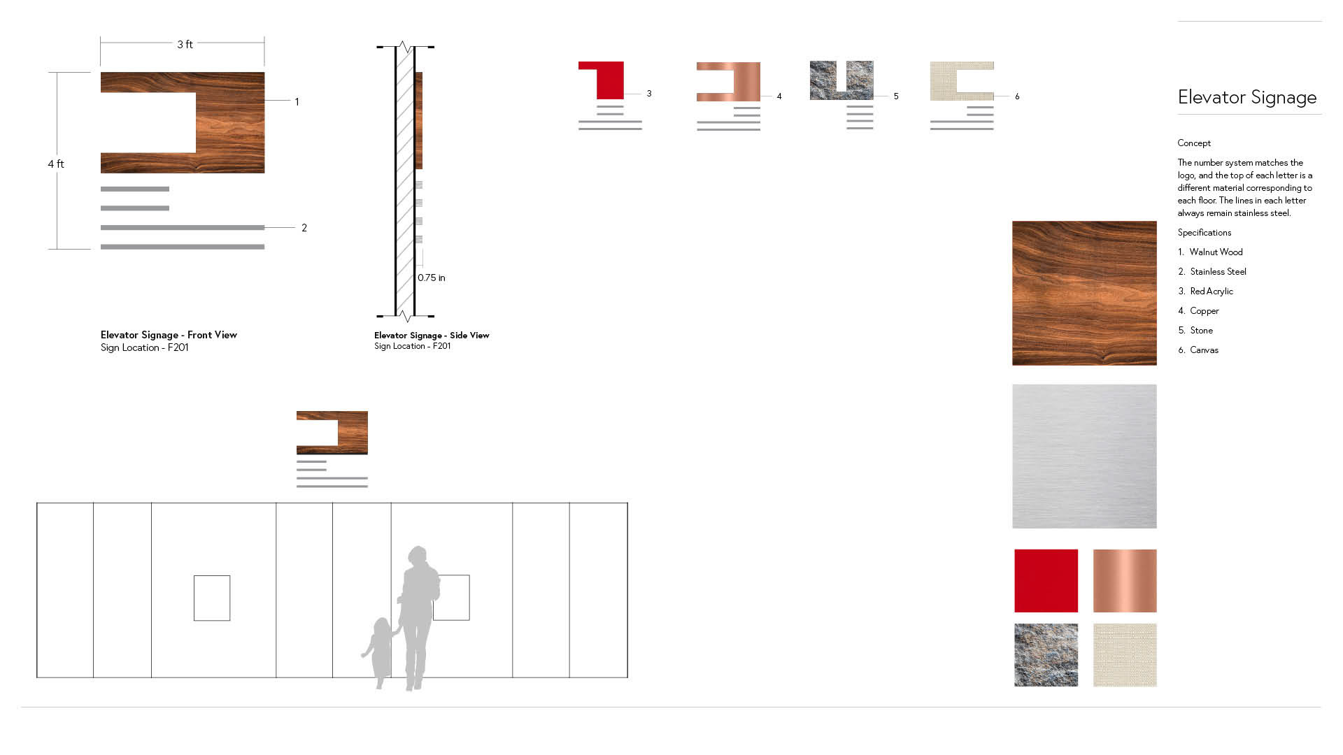 Like I mentioned earlier, each of the different materials used corresponds to the floor number. This is demonstrated below with the elevator number signs that I have designed for each floor.