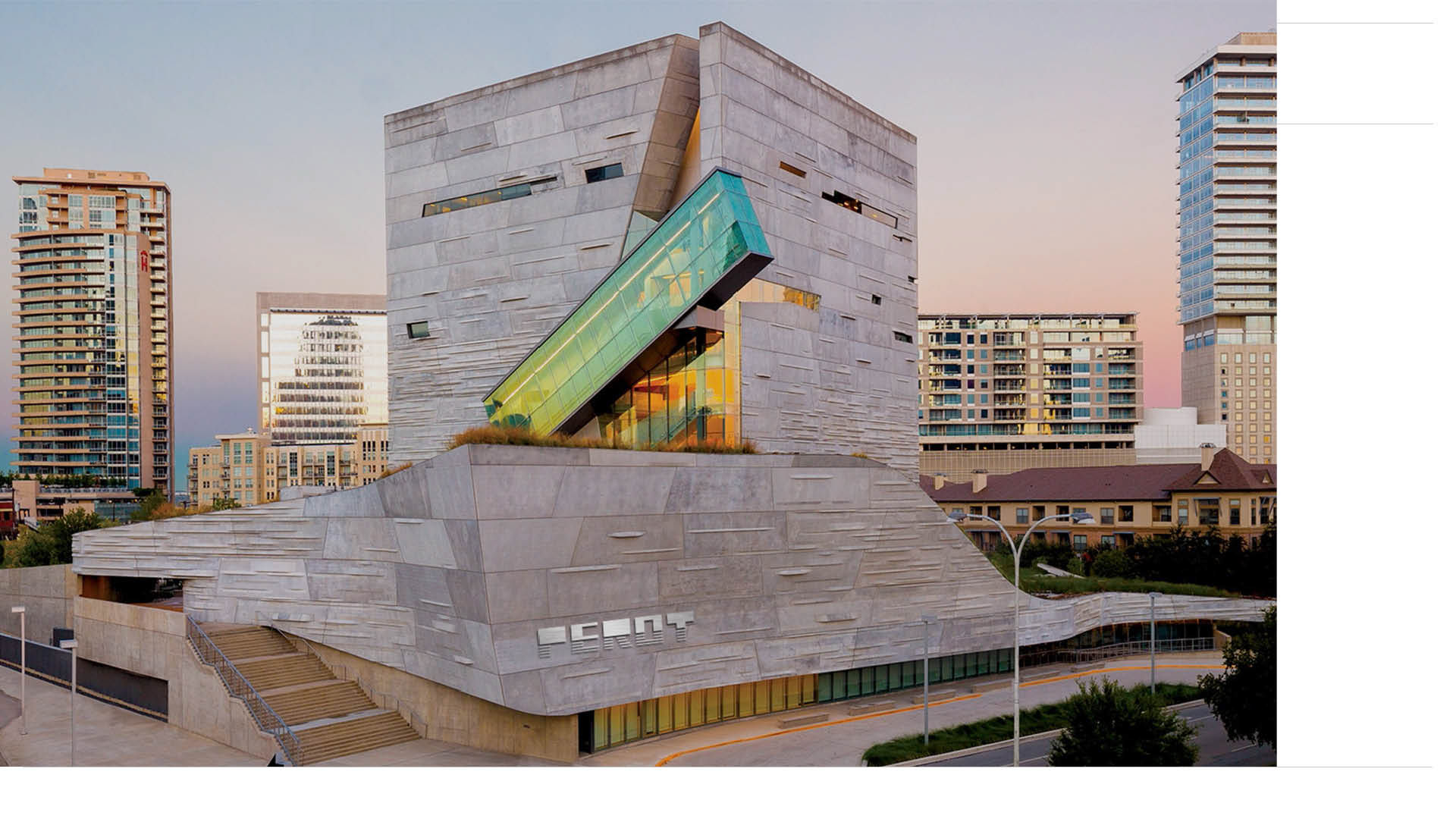 For my logo, I took inspiration from the exterior of the PEROT building itself, as you will see later that the exterior has many thin concrete lines that stick out of the building a tiny bit. This is the main design element I borrowed, and incorporated it into the bottom half of my wordmark. The top half is solid to symbolize the sturdiness of the concrete that the building is made out of, and the blocky shapes are reminiscent of the large window on one side of the building that holds an escalator within.