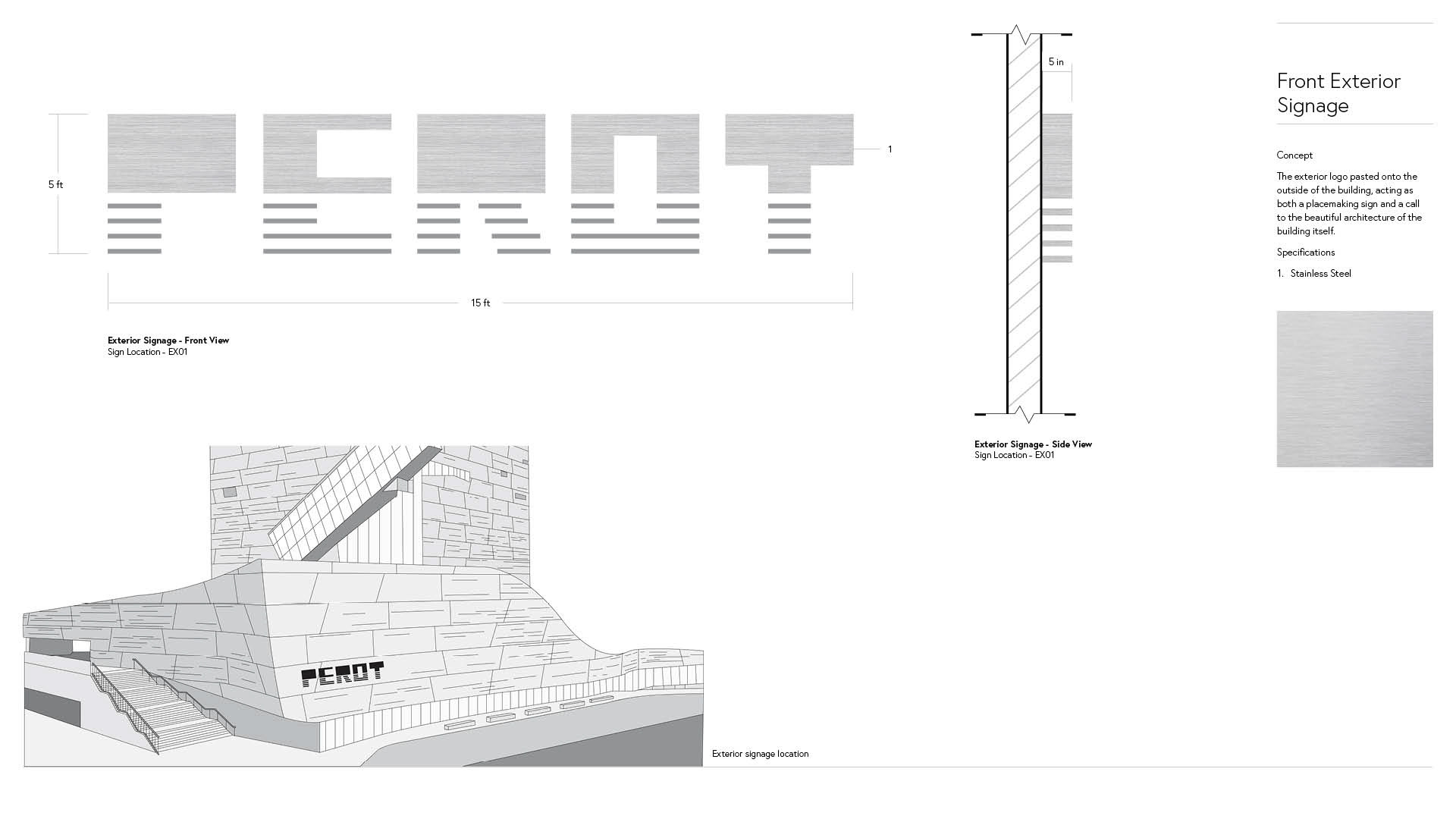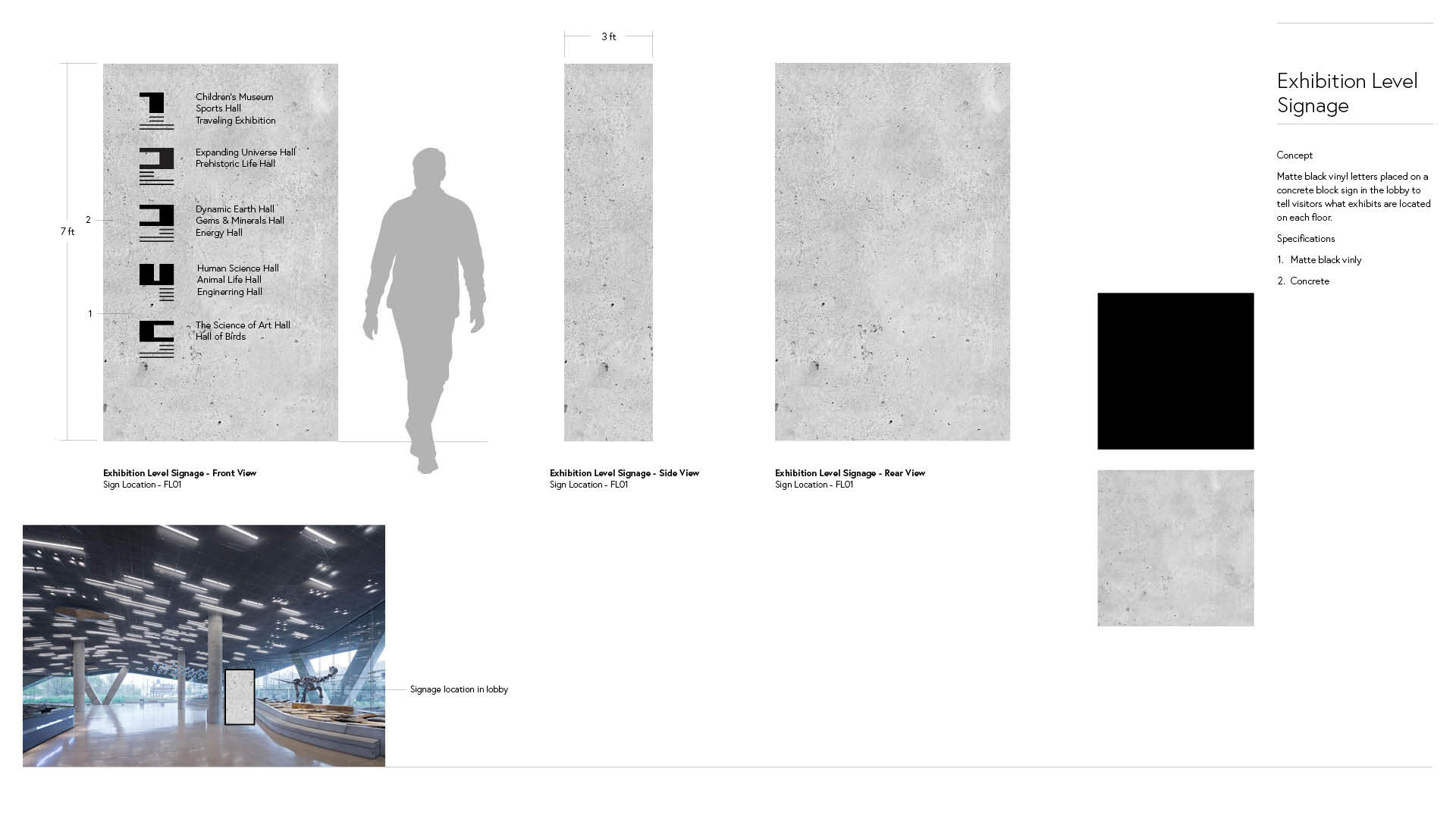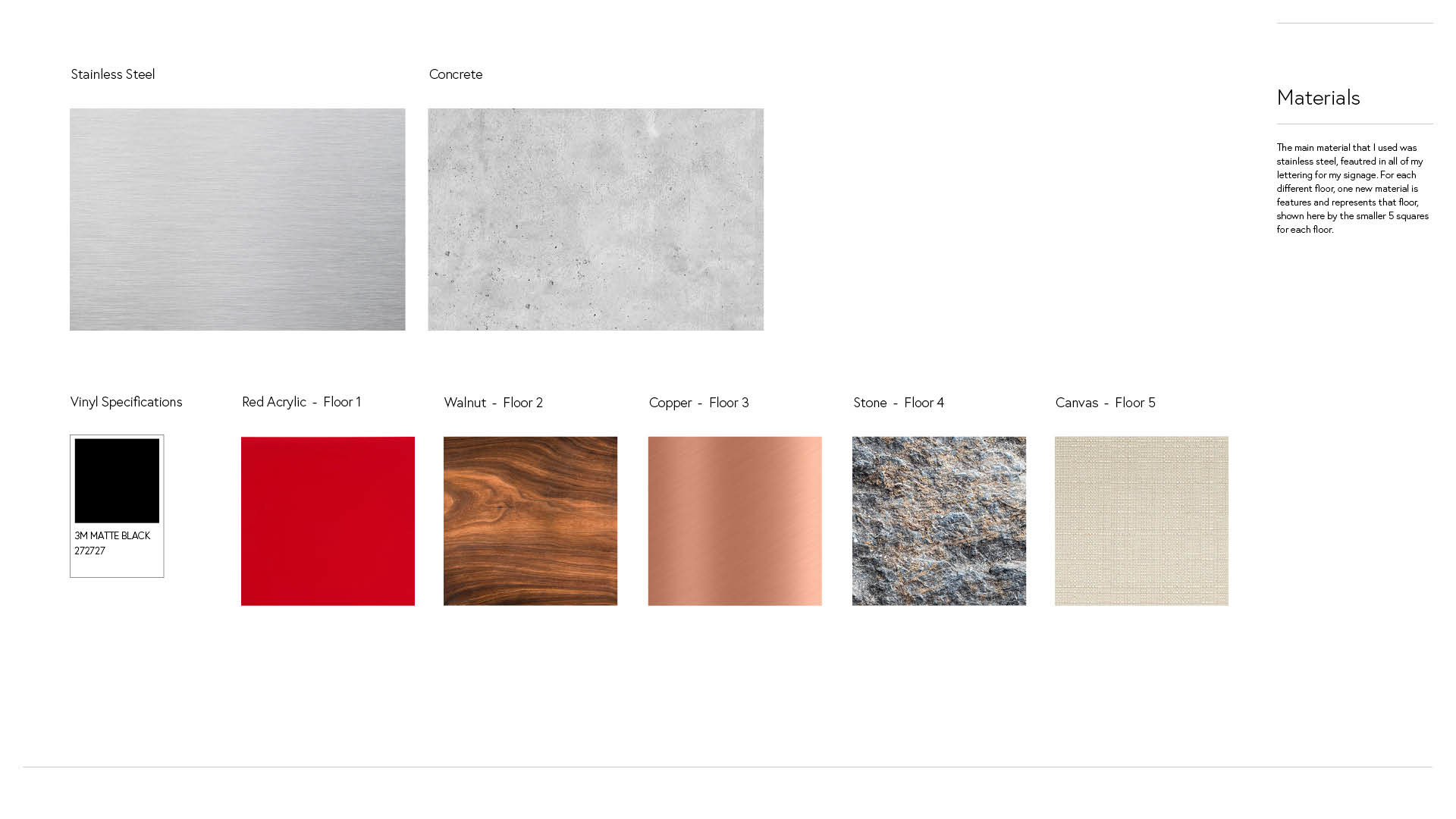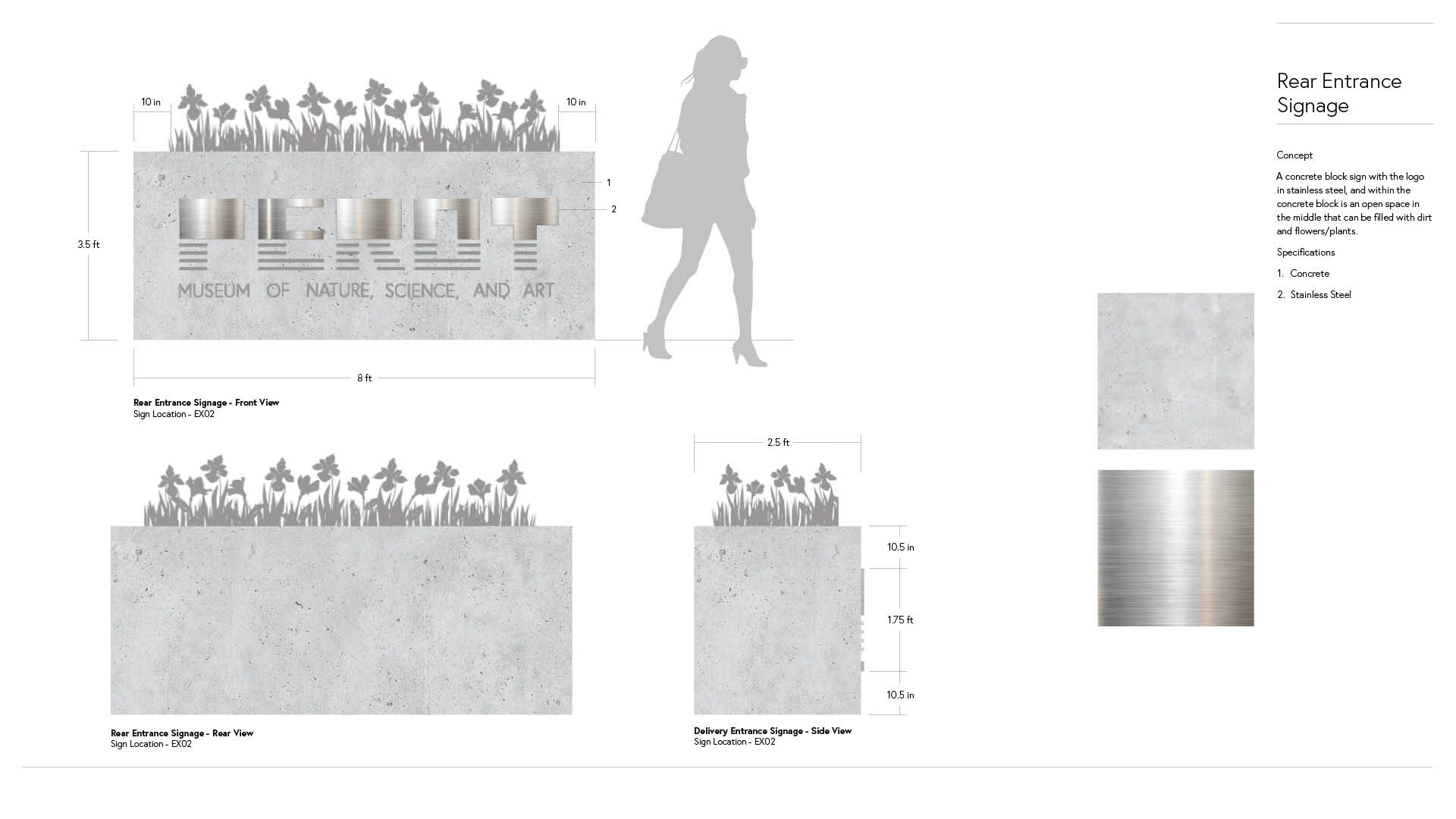 This is a visual guide to the materials that I will be using for my physical environmental signage, with the primary material being concrete to match the exterior of the PEROT building, accompanied by stainless steel for a sophisticated, modern touch. Each of the other materials are unique to each floor of the museum, and can be found used more on their respective floors.