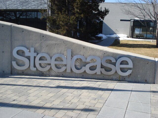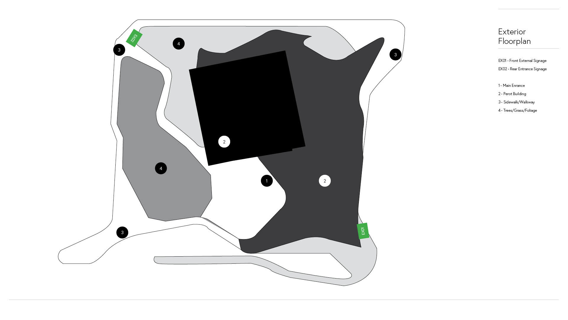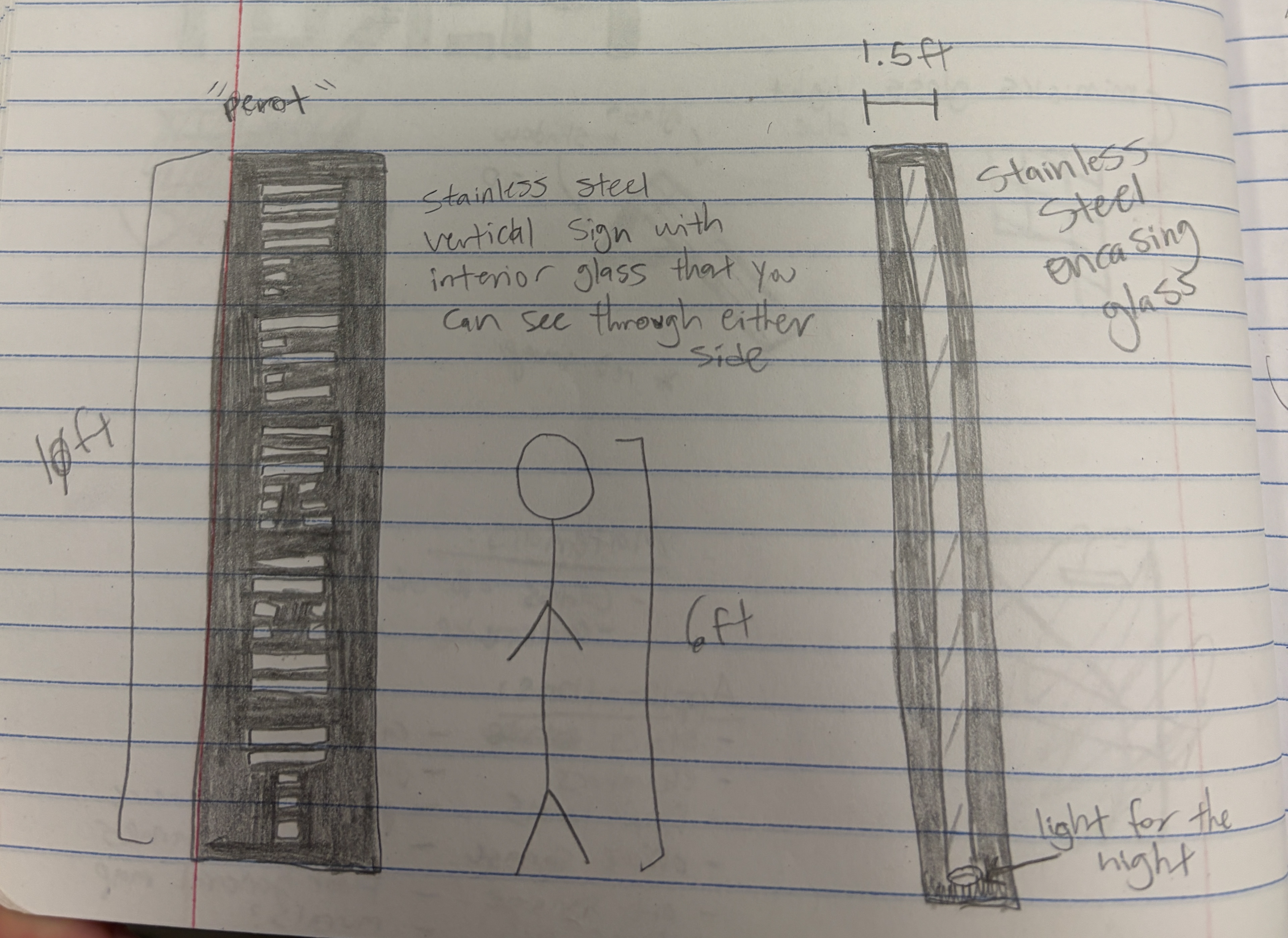 Unfortunately the signage sketch of the vertical light-up PEROT sign was not created in my final designs, but my two exterior designs are the logo on the side of the building, made out of stainless steel, and a concrete slab that is hollowed out in the middle to be filled with dirt and plants. This concrete slab sign features the logo in stainless steel attached to the front, as you will see below.