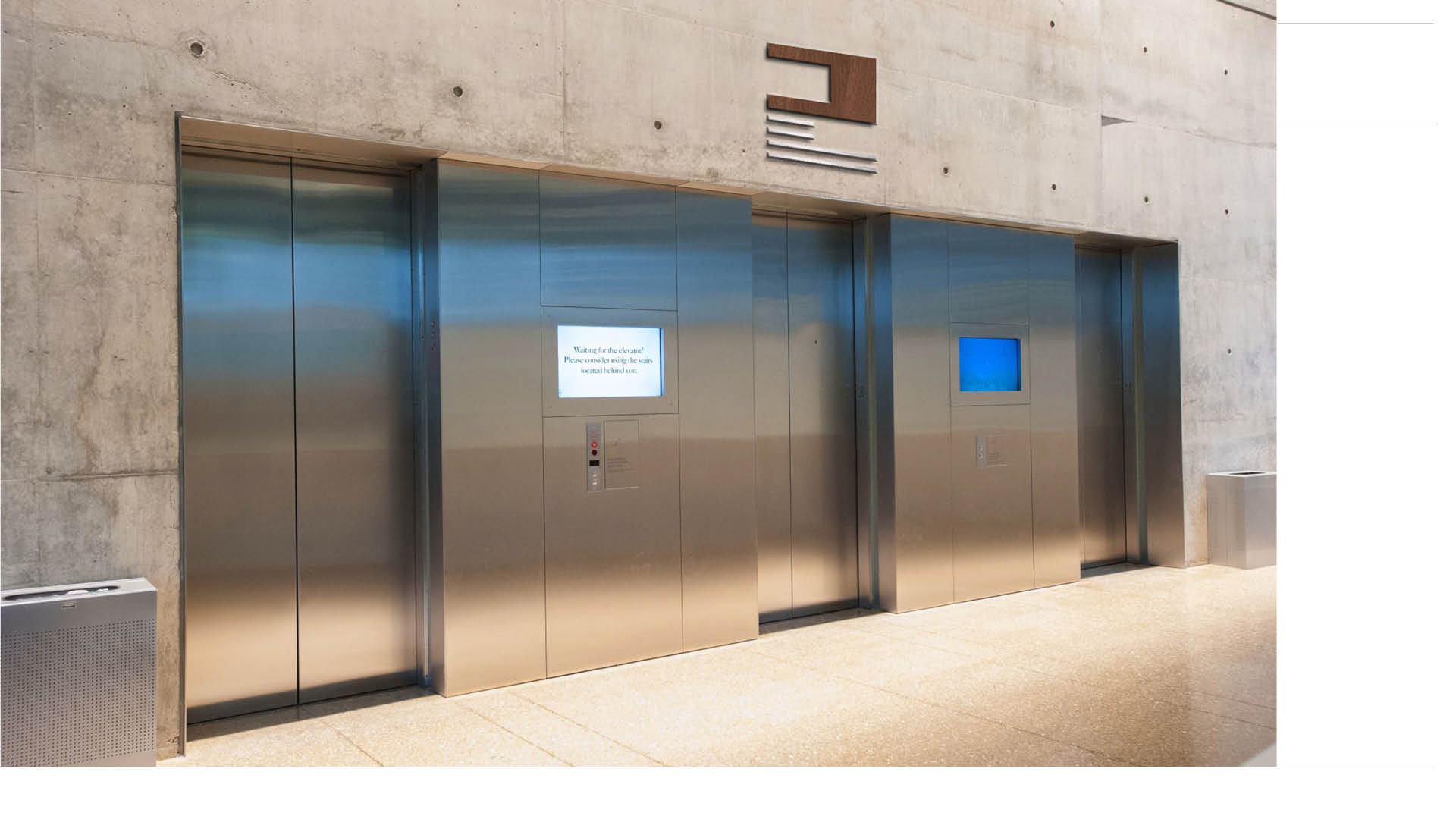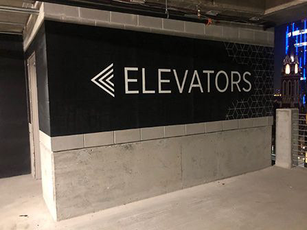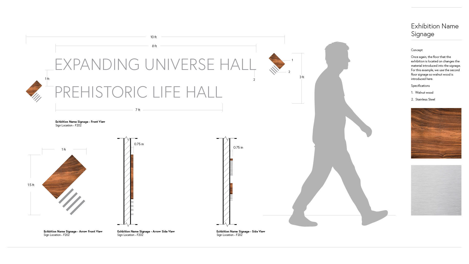 This signage below would be located on the opposite wall of the elevator doors, that way you would see this signage when you get off of the elevator. The materials in the arrows would also change depending on the floor, as this sign is designed to tell you which exhibition is on that floor and in which direction.